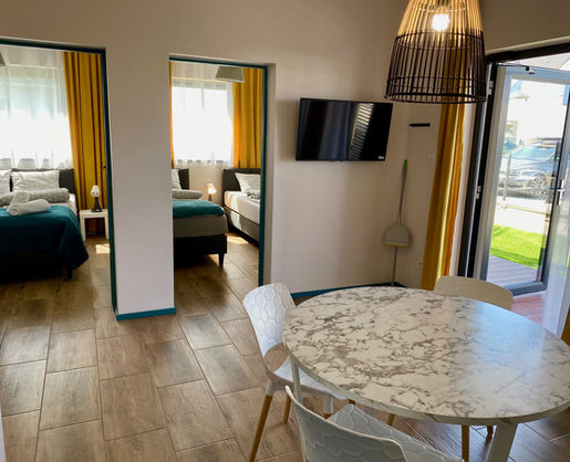 Wygodny i przytulny apartament 4 osobowy z możliwością dokwaterowania dwóch osób. Posiada aneks kuchenny, łazienkę z przestronnym prysznicem oraz dwie dodatkowe sypialnie.